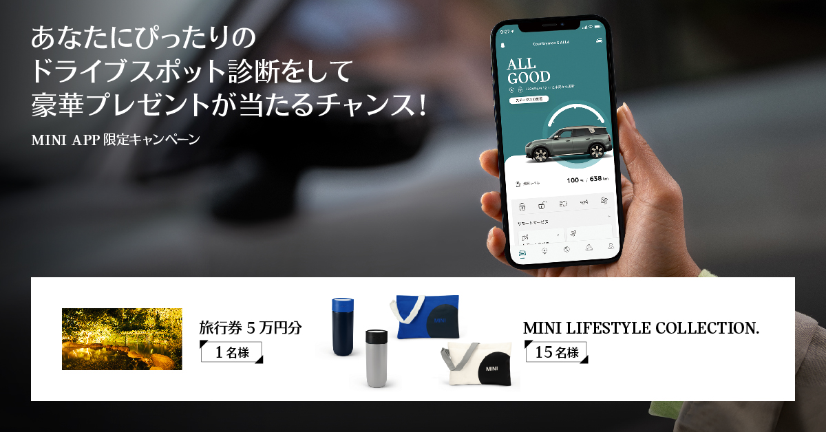 MINI APPのTOPページ下部にある地球儀タブをタップして、「ドライブスポット診断キャンペーンページ」記事より診断を受けていただくと、豪華賞品が当たる抽選にご応募可能です。
